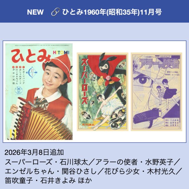 このホームページは、主に昭和三十年代に活躍し、日本の漫画文化の礎を築いた漫画家とその作品を現代に語り継ぐため、当時の漫画雑誌や掲載作品を紹介しています。