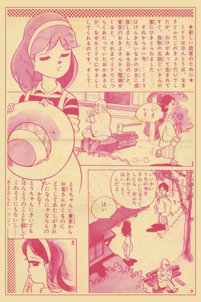 あたらしい読者のために・・・ミドリはほんとうは、なぎさとふたごのきょうだいでしたが、わけがあって、生まれてすぐ、鳥取の五助じいさんの家にひきとられました・・・。それから十一年、ミドリはげんきないなかの少女に成長しました。ある日のこと、東京のおきよさんから電報がくると、それまでミドリにつらくあたっていたおかあさんが、なぜかミドリにやさしくしてくれるのです。そして・・・