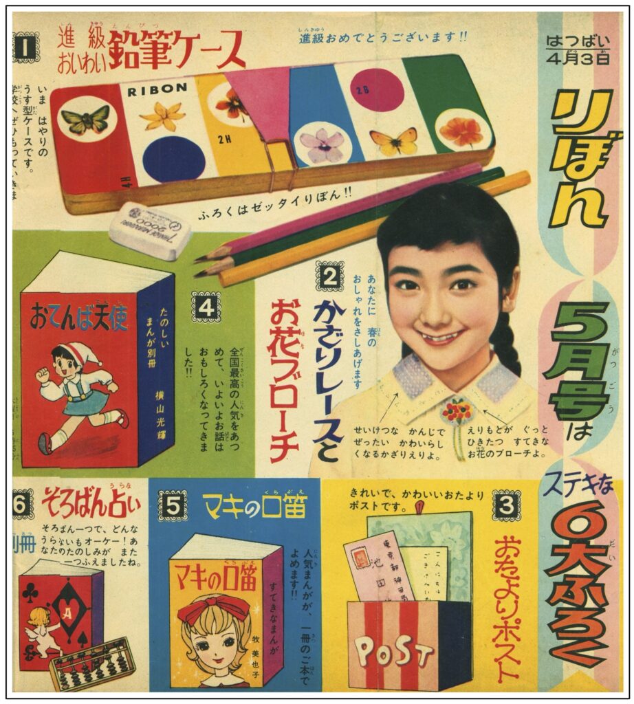 ①進級おいわい鉛筆ケース ②かざりレースとお花のブローチ ③おたよりポスト ④別冊おてんば天使 ⑤別冊マキの口笛 ⑥そろばん占い