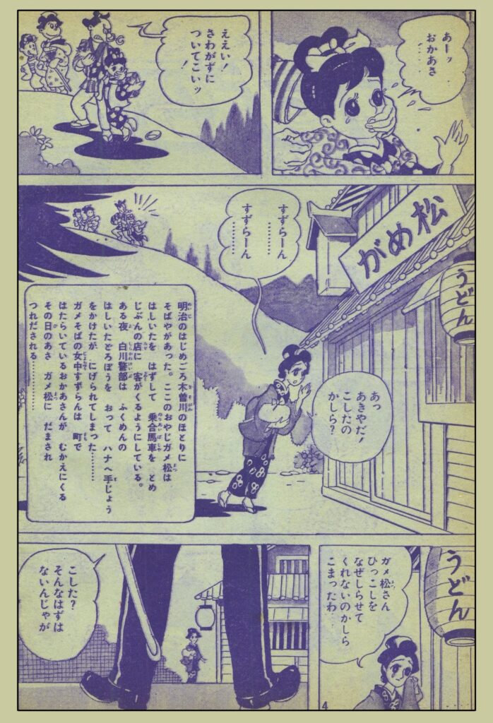 これまでのおはなし・・・明治のはじめのころ木曽川のほとりにそばやがあった。ここのおやじガメ松は、はしいたをはずして乗合馬車をとめじぶんの店に客がくるようにしている。ある夜、白川警部はふくめんのはしいたどろぼうをおってハナへ手じょうをかけたがにげられてしまった・・・ガメそばの女中すずらんは町ではたらいているおかあさんがむかえにくるその日のあさ、ガメ松にだまされつれだされる・・・