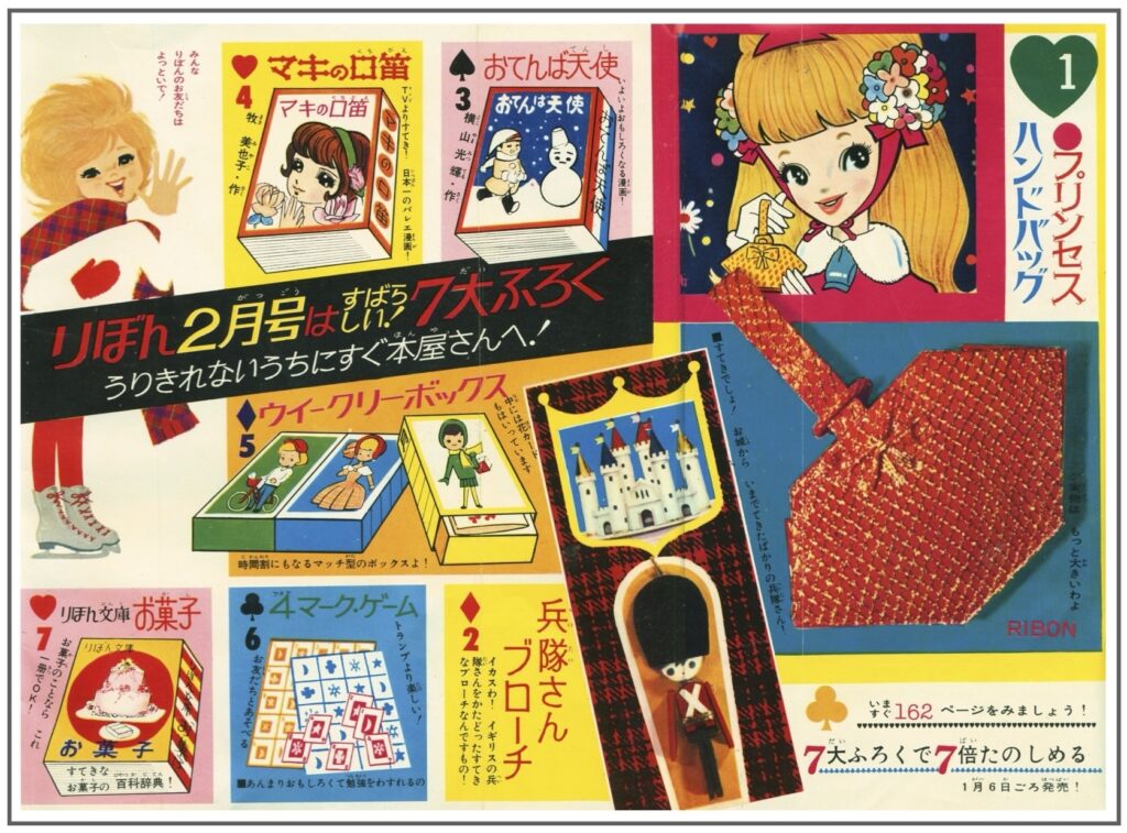 ①プリンセスハンドバック②兵隊さんブローチ③別冊「おてんば天使」1月号新連載の「東京天使」と並行連載④別冊「マキの口笛」⑤ウイークリーボックス⑥4マーク・ゲーム⑦りぼん文庫・お菓子