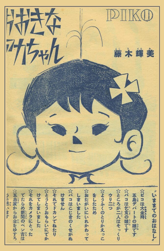 いままでのおはなし・・・ピコは大金持ち五島デパートの娘です。パコは乞食の娘です。ところが二人はそっくりウリ二つ。ようふくのとりかえっこしたため、おたがいにいれかわってしまいました。パコはこじきのくせがぬけません。ドカンでねたり、とうとうおもらいにでかけてしまいました。それをカメラにとったでたらめ新聞のペン吉は、父は五島家からお金をゆすろうと思います。