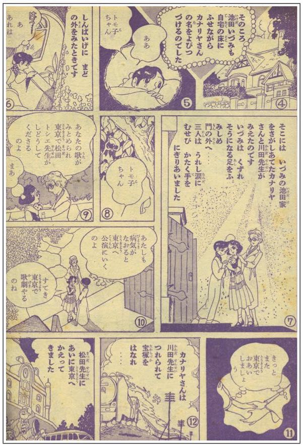 再会を目のまえにして 病気にたおれた池田いずみをたずねて みしらぬ宝塚をさまようカナリヤさん(青山トモ子)の運命は・・・また 北海道でカナリヤさんの名をよびつづける松田トシエ・・・。そして 川田先生は思いきって東京を旅だちました。