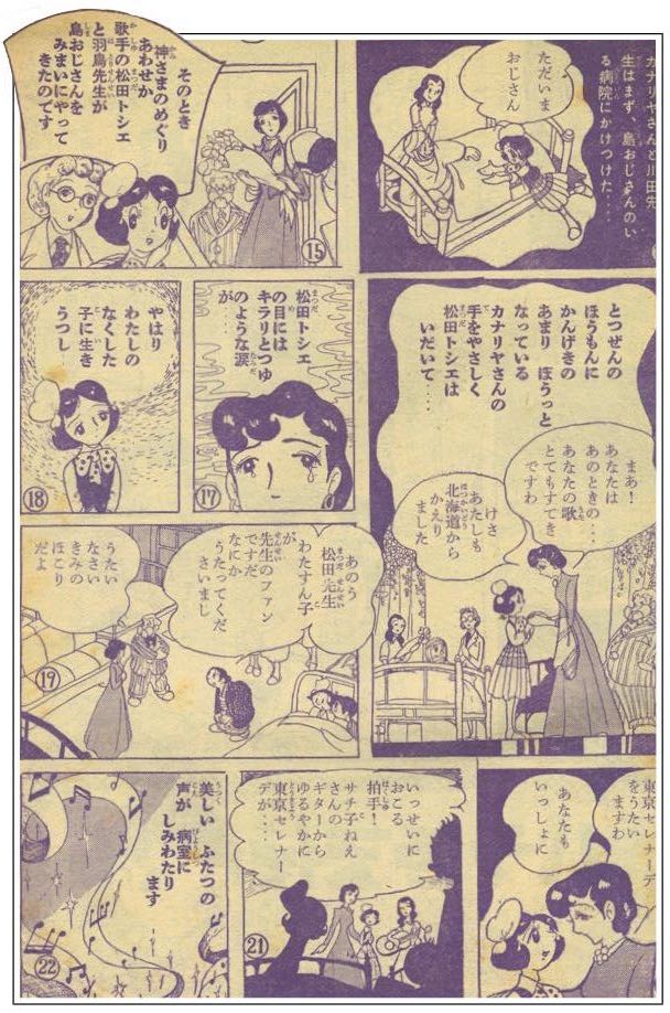 作品について・・・「そよ風さん」はドフトエフスキーの「白痴」の少女版とも読めるストーリーである。無垢な純粋さゆえ周囲の人に理解されない少女(そよ風さん)を主人公にして始まったが、読者の理解も得られなかったようである。1956年1月号でそよ風さんは上京する事になり、その後はタイトルを「ひまわりさん」(1956年2月号 – 1956年12月号)に変えて、ストーリーは上京先の活発な少女ひゆ子が中心でそよ風さんは脇役にまわるという異質の作品であった。