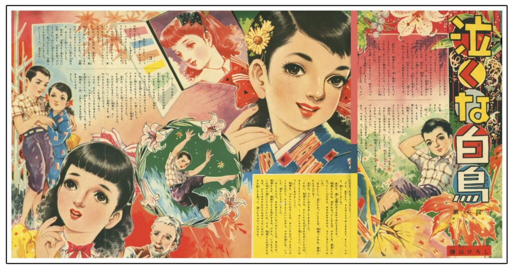 昭和20年代末から30年代初頭にかけて、少女雑誌を席巻した絵物語。その絵物語を手がけた画家の中で最も人気を博した勝山ひろし。昭和25年頃から小学館の『女学生の友』に挿絵、口絵を描いて人気を集め、昭和30年代には『少女』『少女クラブ』『少女ブック』『りぼん』『なかよし』と、少女雑誌全般に多数の絵物語を発表した。