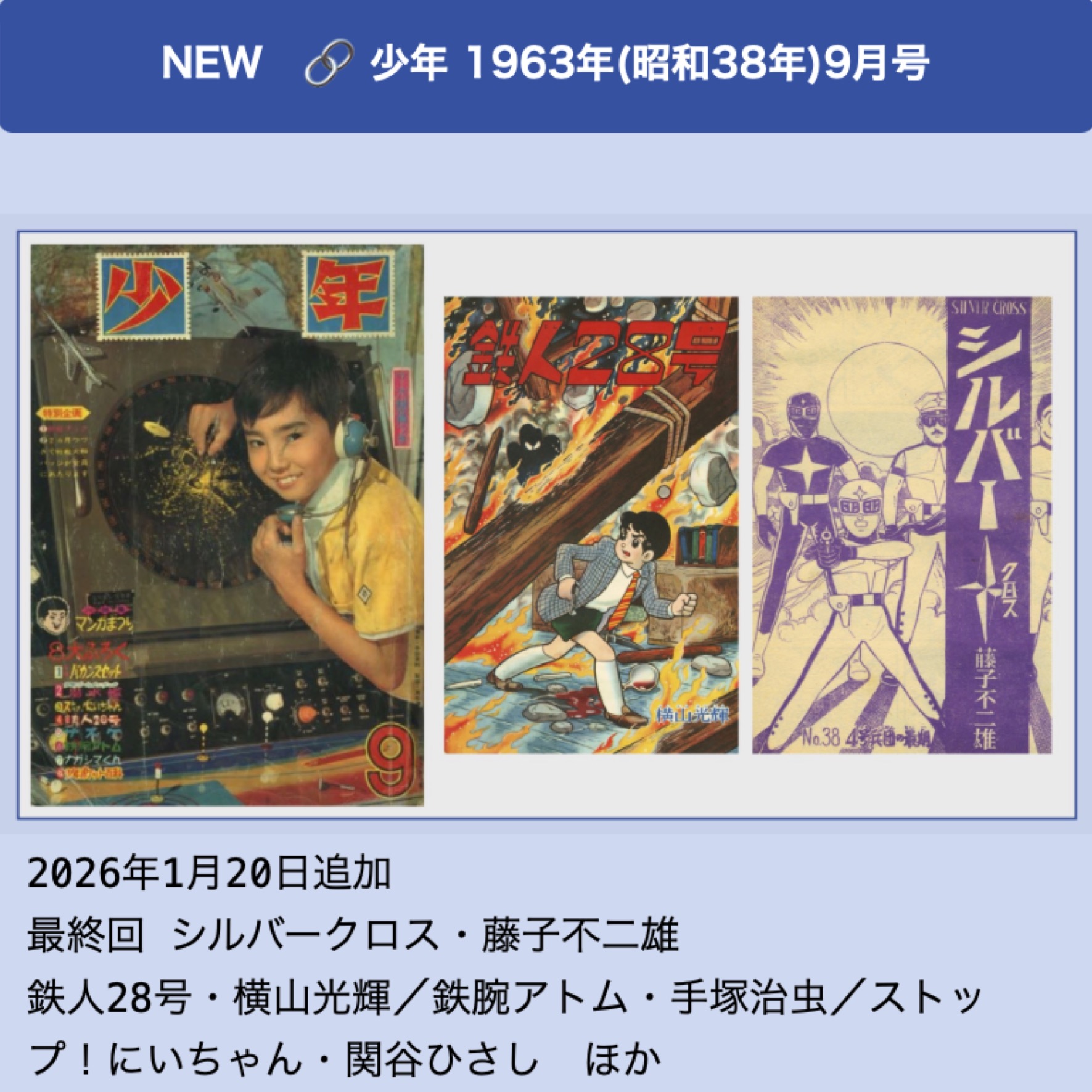 本号掲載の『シルバークロス』の最終回を紹介。さらに、小学館クリエイティブから発行された「新編集版」より連載開始回と、本号掲載の『鉄人28号』屈指の人気エピソード「ブラック博士の巻」クライマックスなどの詳細を紹介する。