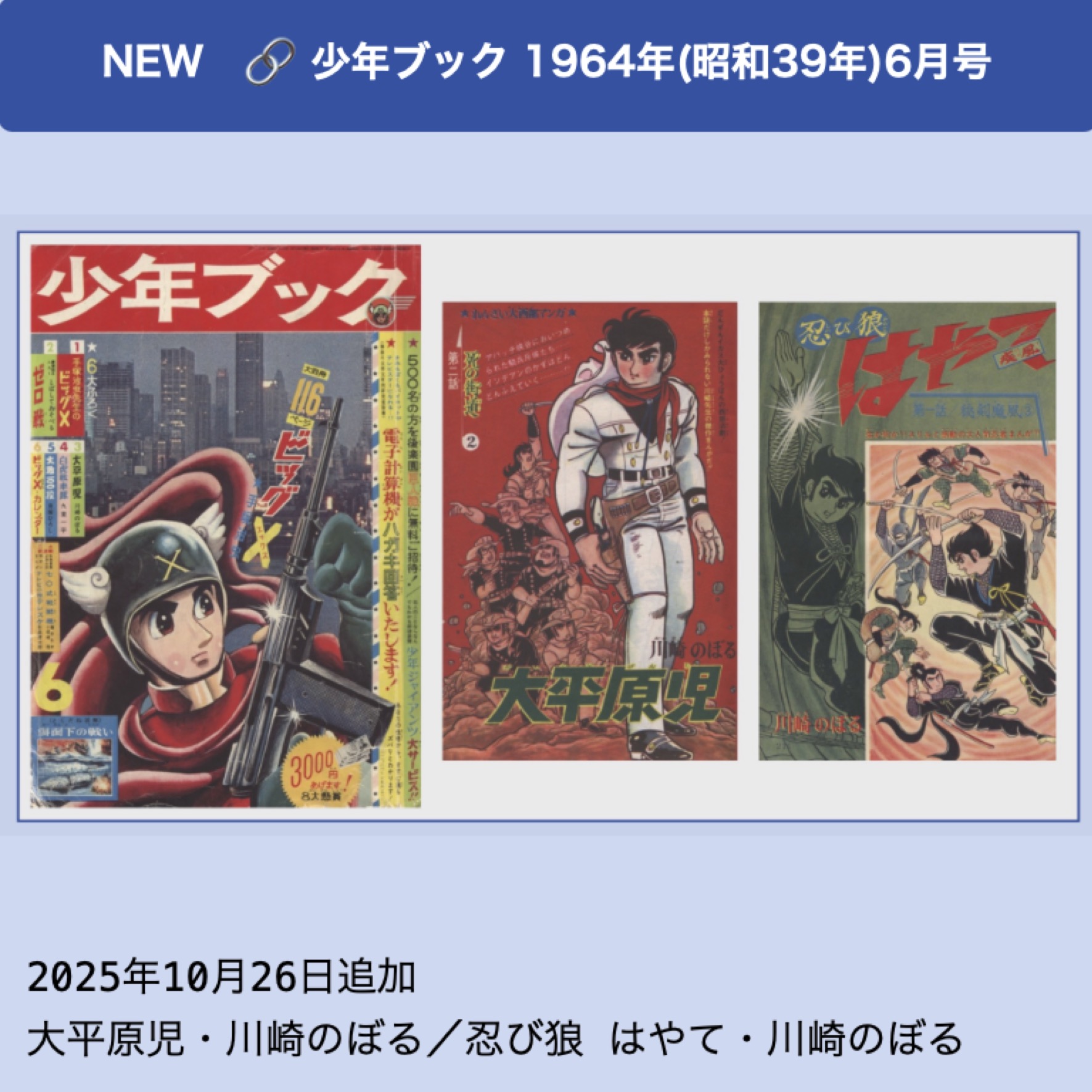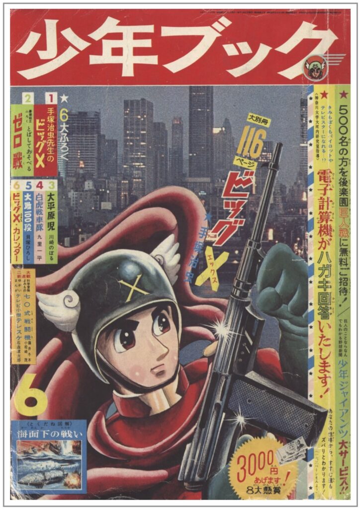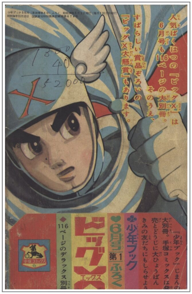 手塚治虫作品 「ビック X」 掲載中の少年ブックである。この号、「ビック X」 は別冊付録のみの掲載であるが、B6版116頁の分厚い別冊である。当時、B6版別冊付録の頁数はそのほとんどが26頁から66頁程度であったのに対して、116頁で、それが手塚治虫作品であったのは、『少年ブック』の読者獲得にもつながった。