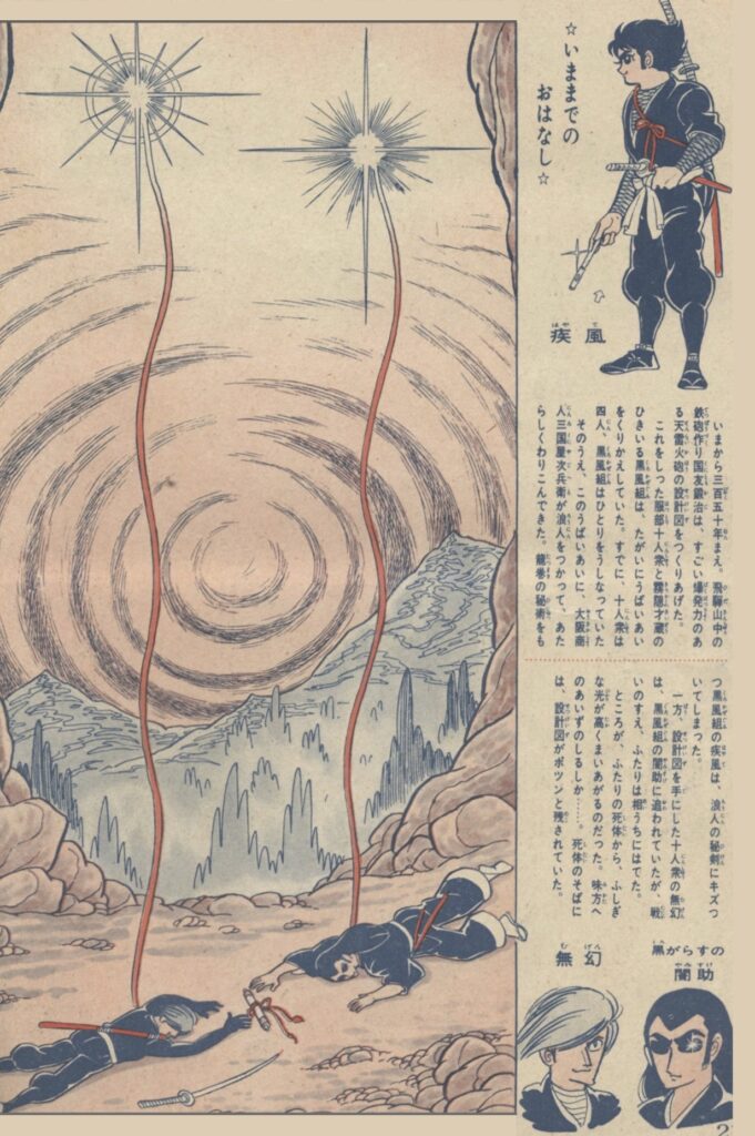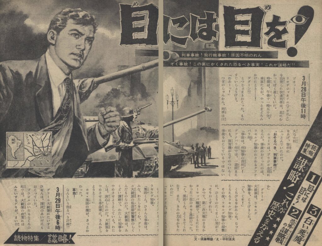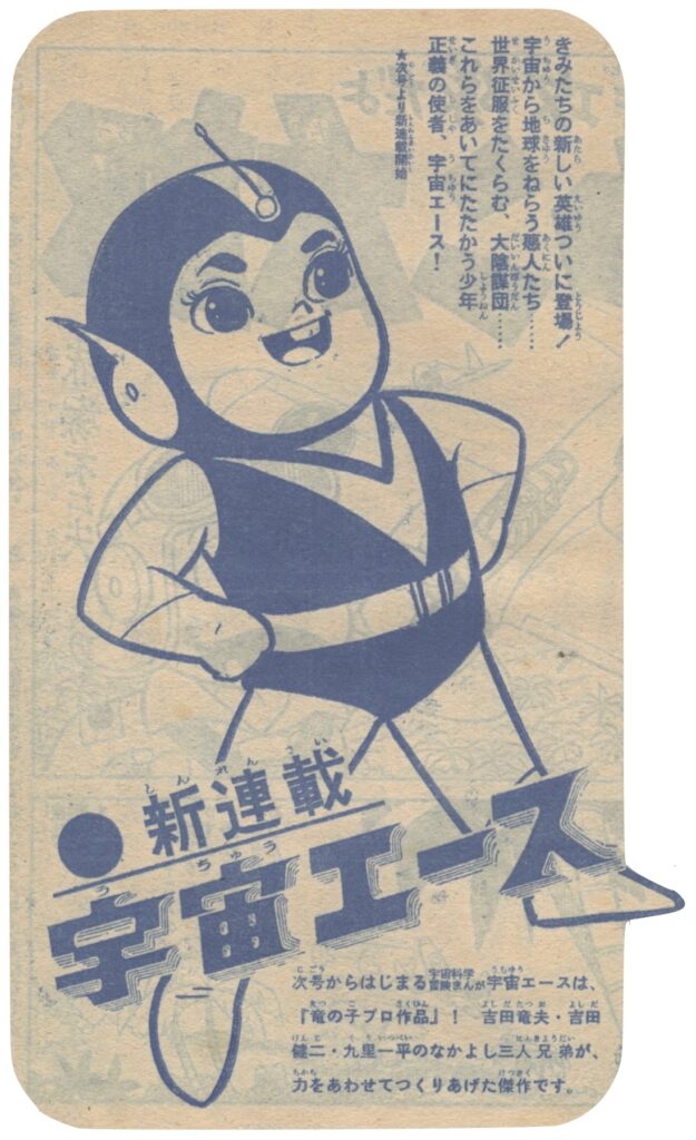次号からはじまる宇宙科学冒険まんが宇宙エースは『竜の子プロ作品』!吉田竜夫・吉田健二・久里一平のなかよし三人兄弟が、ちからをあわせてつくりあげた傑作です。きみたちの新しい英雄ついに登場!宇宙から地球をねらう悪人たち・・・世界征服をたくらむ、大陰謀団・・・これらをあいてにたたかう少年、正義の使者、宇宙エース !