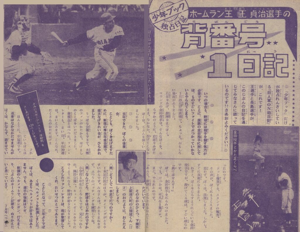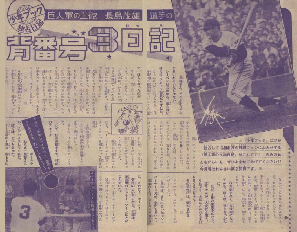 巨人軍のホームラン王 王貞治選手の背番号1日記と主砲長島茂雄選手の背番号3日記 『少年ブック』 だけが独占連載している 『巨人軍ON砲日記』 が謳い文句の連載記事。