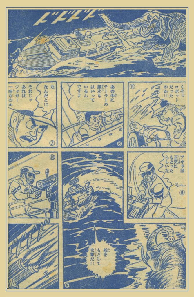 前号までのあらすじ・・・アキラはジャガー、一味の急襲を受けたショックで記憶喪失症にかかってしまった。しかし、とつぜんの光にあたると、数秒間だけ、正気にかえることができるのだ。そんな、アキラの状態のまえに、またしてもジャガー、一味の新兵器"マンモス"があらわれたのだ‼︎そして、いままさに、そのマンモスがアキラと隊長に襲いかかろうとしている・・・‼︎