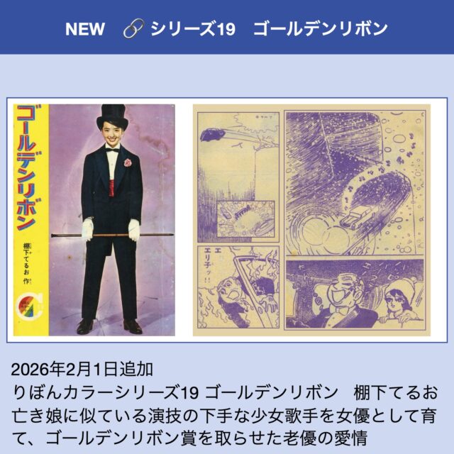 りぼんカラーシリーズおおくの人にすぐれた漫画をよんでいただきたい。このねがいをこめておおくりするのが 「りぼんカラーシリーズ」です。ひとつひとつの作品がいつまでもみなさんの心のかたすみに生きつづければうれしいと思います。『りぼん』編集部『りぼん』の別冊付録「りぼんカラーシリーズ」は愛と感動の物語をテーマに掲げて1963年から69年にかけ月例誌77冊と増刊2冊の全79冊を数えた。